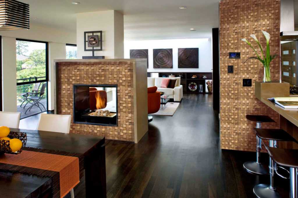 - Облицовка стен деревянной мозаикой актуальна для интерьеров, выполненных в многих популярных стилях, так как отлично сочетается со многими материалами – стеклом, металлом, керамикой, бетоном;