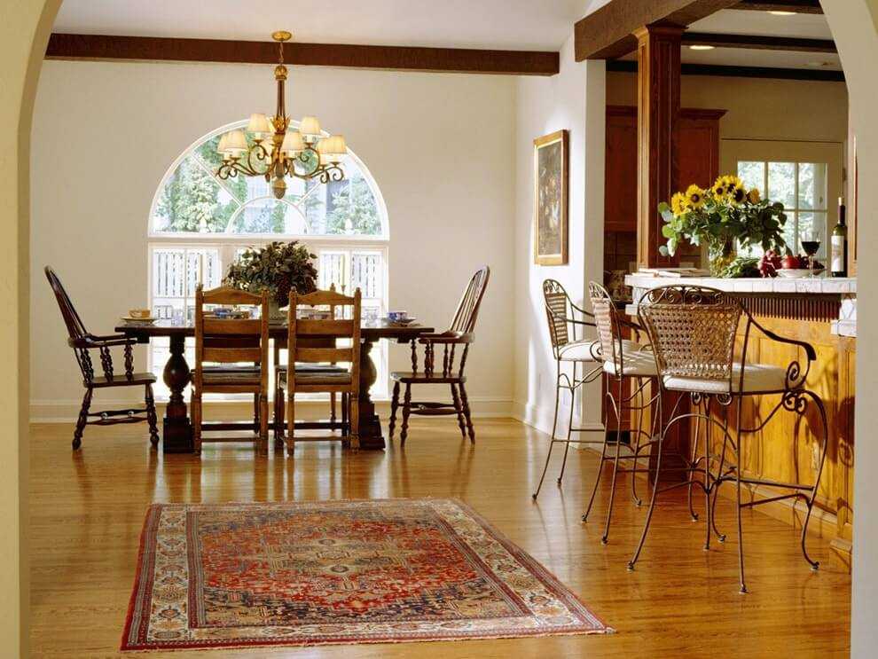 Напольным покрытием в таком помещении может служить паркетная доска, плитка, натуральное дерево или его имитация. Пол должен быть на несколько оттенков темнее, чем стены и двери. В европейском стиле интерьера допустимы различные виды ковров (как трикотажные полотна, так и ковры с высоким ворсом). Этот элемент декора позволяет уравновесить аскетичность и теплоту атмосферы в квартире.