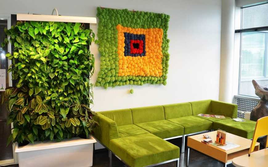Сделать убранство любого помещения в доме уютным и оригинальным поможет использование картин, надписей и других элементов из объемной зелени. К примеру, отдельные кусочки легких панелей могут использоваться для создания на стенках абстракций, стилизованных узоров. Не менее привлекательно и украшение мебели с помощью необычных растений. Добавление «пушистого» слоя к подлокотникам, изголовьям, другим частям каркасов способствует легкой стилизации изделий. Довольно часто дизайнеры используют необычные шарообразные растения для украшения настольных и напольных светильников. Очень красиво смотреться такой покров будет с маленькими статуэтками на подоконниках. Таким способом можно создать стильную панораму перед окном. Вариантов применения споровой зелени множество: их можно использовать для обновления отдельных элементов или применять в качестве основы для создания новых изделий.