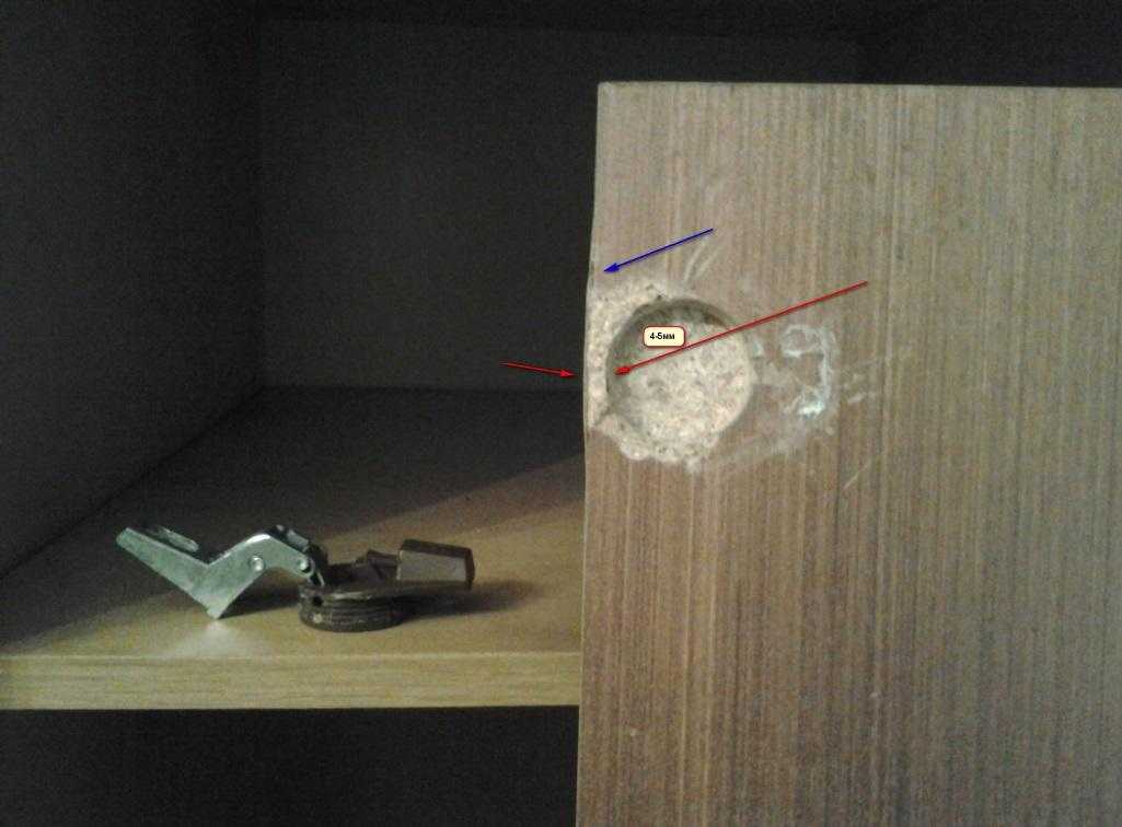 Нередко при резком открывании шкафчика из дверцы вырывается петля либо повреждается крепеж, вокруг которого формируется значительный дефект. Также проблема возникает при просверливании нового отверстия рядом со старым, когда между ними ломается тонкая перемычка. Есть два способа ремонта ДСП с таким типом повреждений: