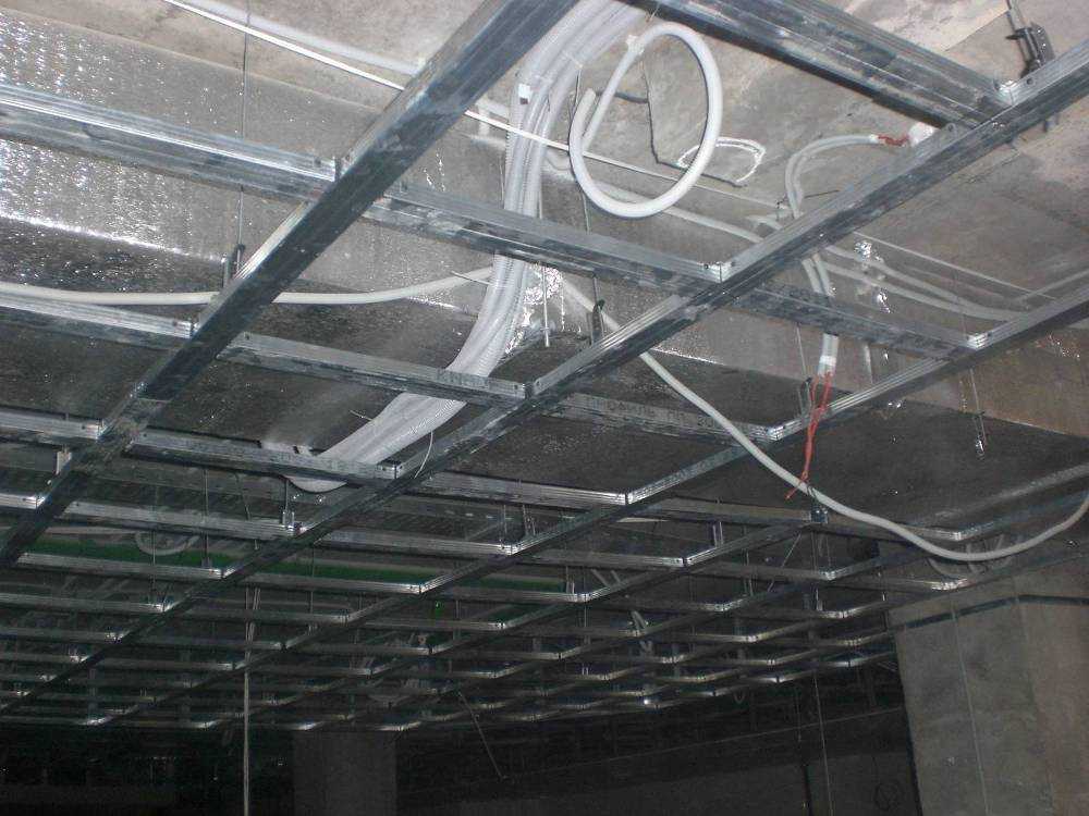 Легкий несущий каркас, чаще всего имеющий форму решетки, собирают из отдельных металлических профилей. Удерживают потолок металлические подвесы, которые могут выполняться в виде стержня, толстой проволоки или кронштейна. Верхний конец подвеса крепят с помощью дюбеля или анкера к базовому потолку, а нижний заводят в установочное отверстие или в направляющие на каркасе. Длину подвеса можно немного регулировать, что позволяет образовать из профилей ровную горизонтальную (или расположенную под нужным углом к горизонтали) плоскость. Количество креплений определяется площадью и весом потолка и берется обычно из расчета 7-10 штук на 10 м2.