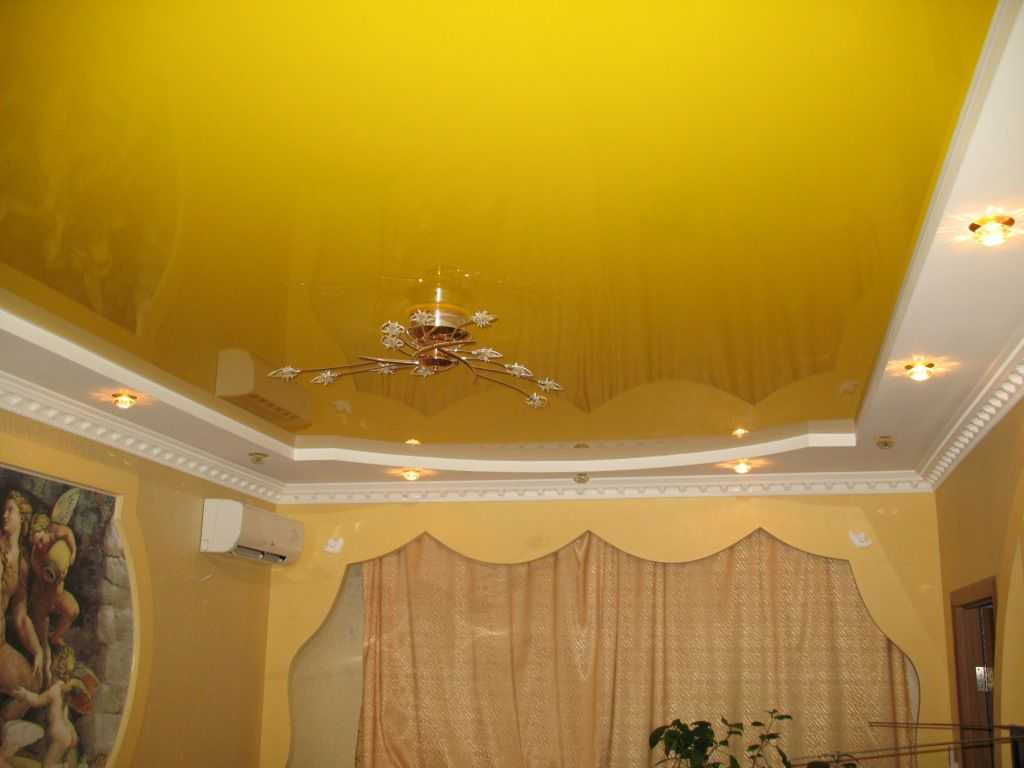 В рабочем кабинете или офисе лучше всего установить потолки желтого цвета. Они повышают работоспособность. И не рекомендуется использовать голубой, синий, фиолетовый, которые расслабляют.