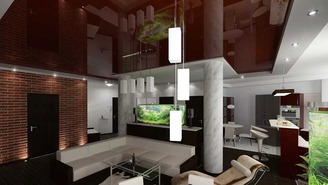 Тёмные цвета делают комнату более низкой. Но гладкое полотно отражает свет и обстановку, из-за чего эффект практически не заметен. Чаще всего для коричневых потолков выбирают именно лаковую фактуру.