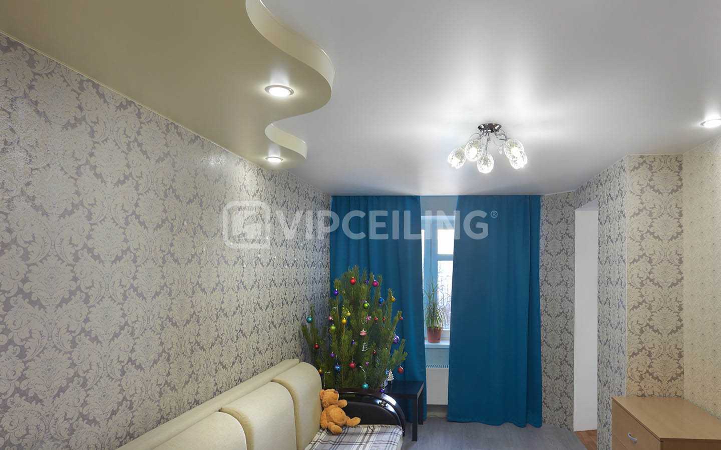 На фото – двухцветные натяжные потолки в зале.