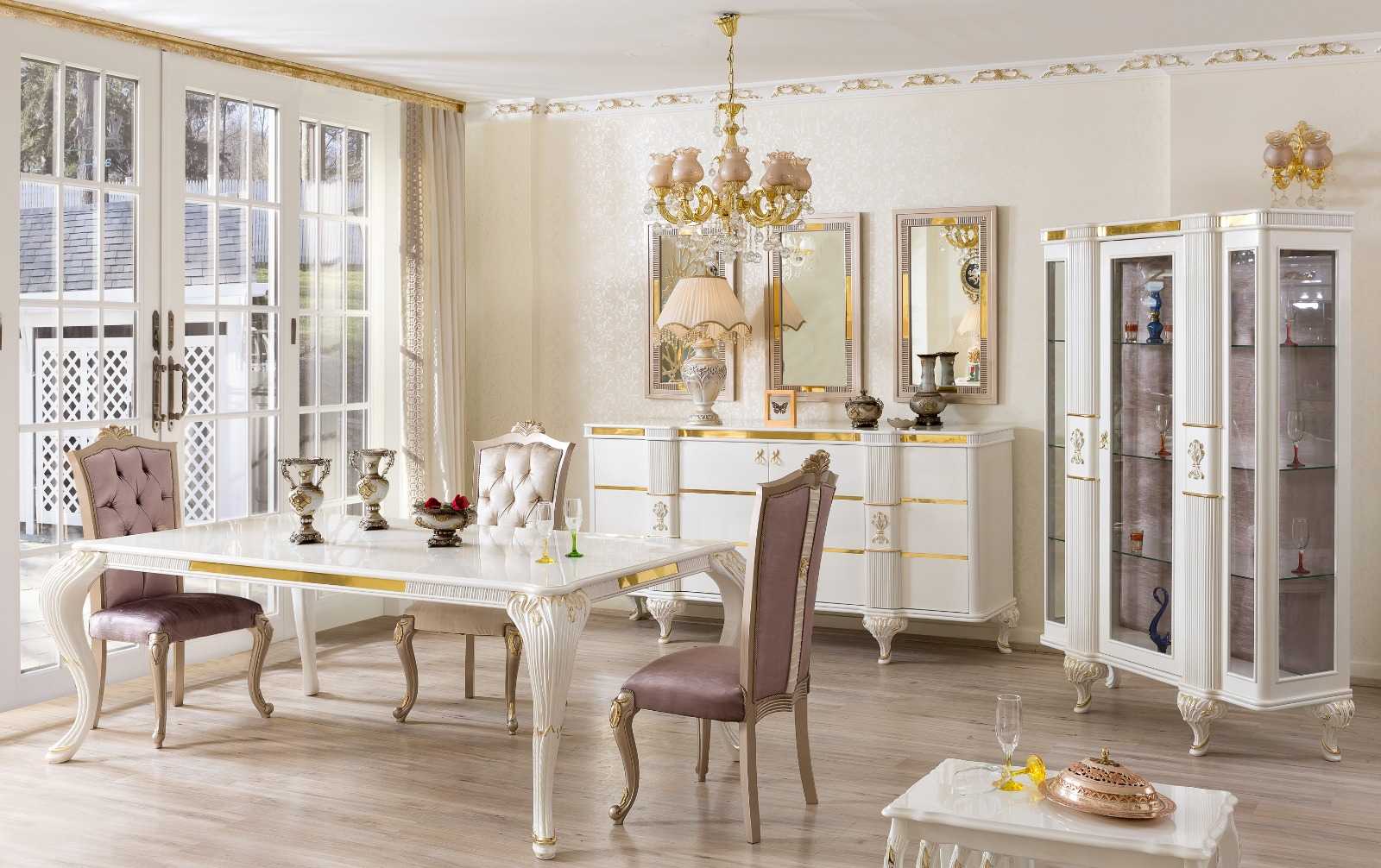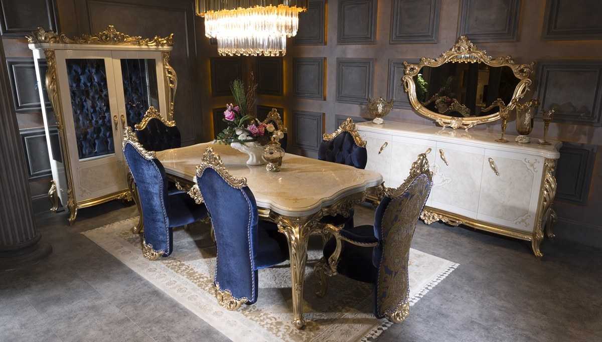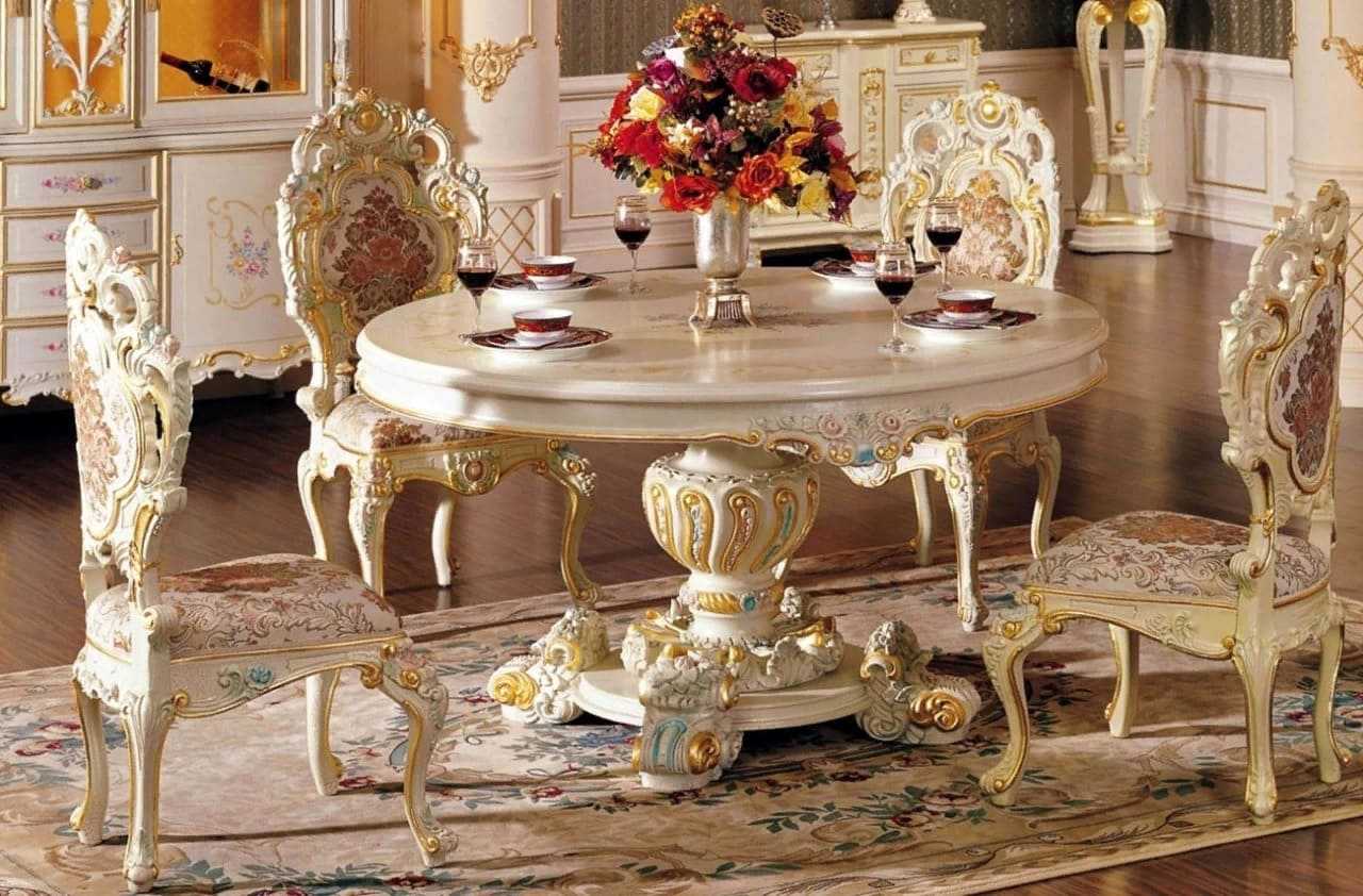 В кухонной и столовой зонах квартиры или дома рекомендуется ставить самые красивые гарнитуры. Советуют также применение расписываемой мебели (с включением ажурных деталей). Для обивки используют шелковую либо бархатную материю, желательно с рисунком. Чтобы сформировать максимально изысканный интерьер, целесообразно декорировать пространство камнем.