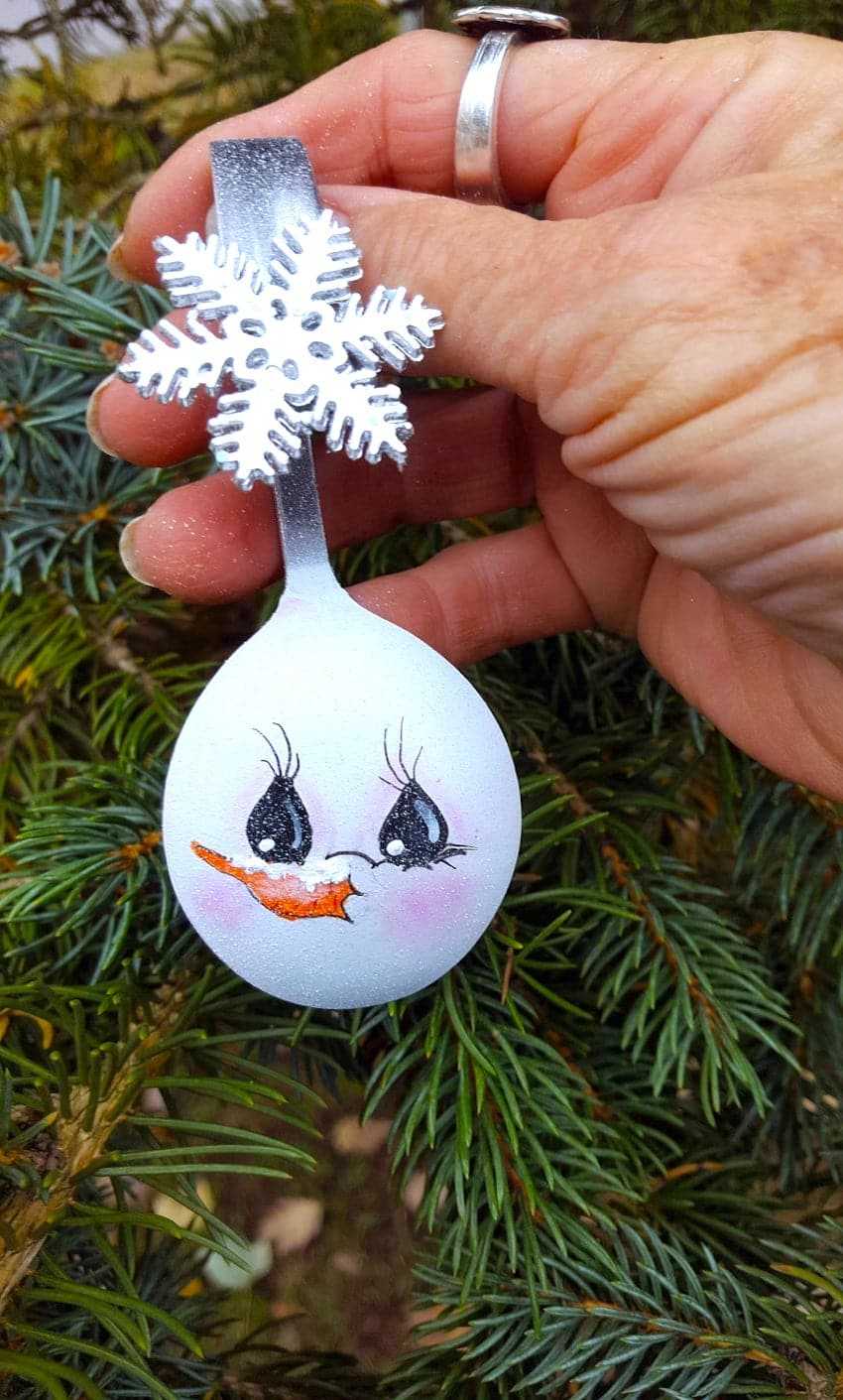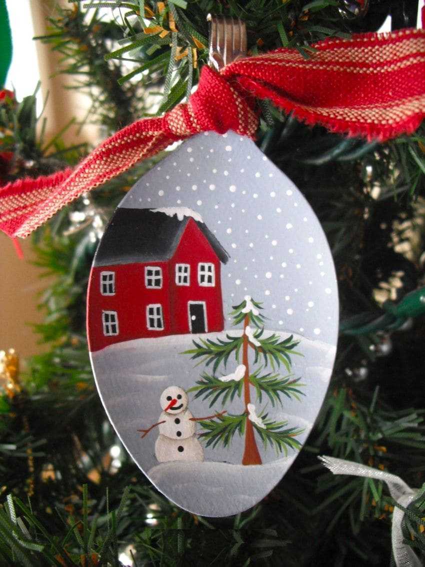 Расписные ложки. Использовать удобнее алюминиевые ложки. Их окрашивают белой акриловой краской. После высыхания наносят новогодний рисунок. При отсутствии навыков рисования можно использовать наклейки. Ручку ложки сгибают и вешают украшение на ветку елки.