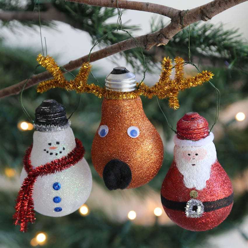 Игрушки из лампочек. Отслужившие свой срок электрические лампочки смогут послужить основой для оригинальных елочных игрушек. Их расписывают, создавая разнообразные яркие образы. После высыхания рекомендуется поверхность покрыть для устойчивости тона лаком. В качестве дополнительного декора выступают бусинки, мишура, тесьма, бисер и пр.