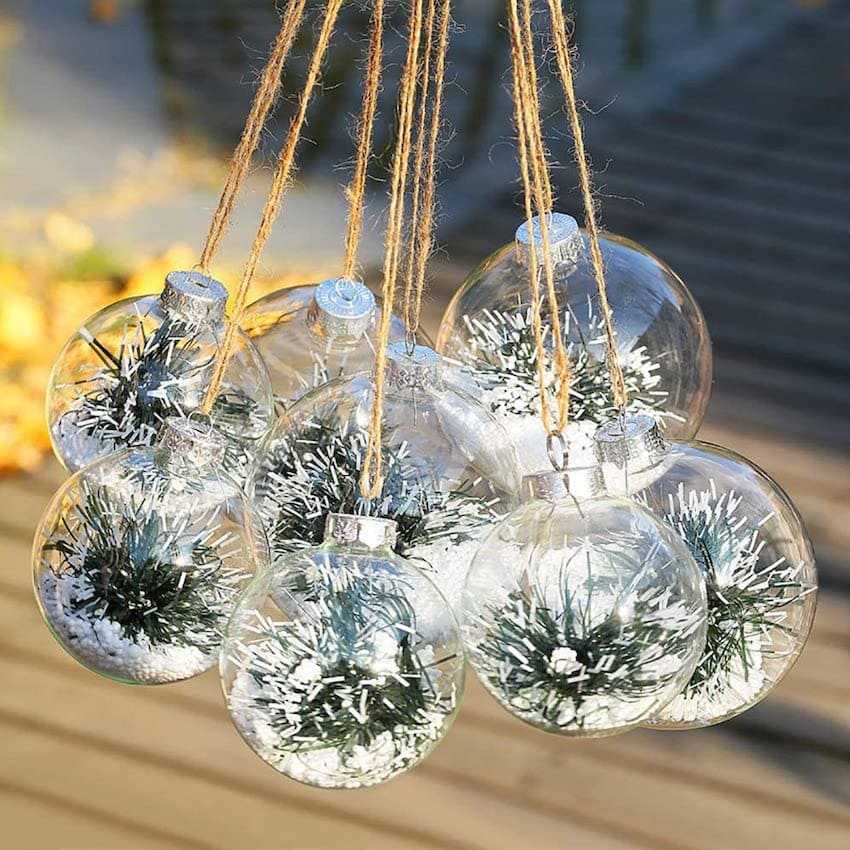 Выбирают из имеющегося дома ассортимента елочных игрушек прозрачные достаточно объемные шарики, домики, шишки