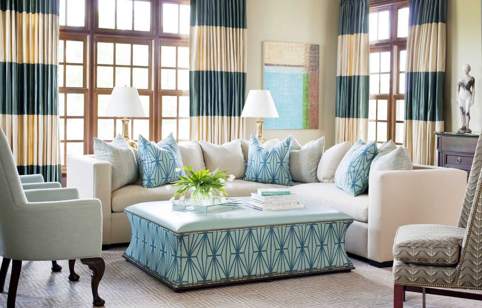 Шторы в широкую горизонтальную полосу в дизайне гостиной