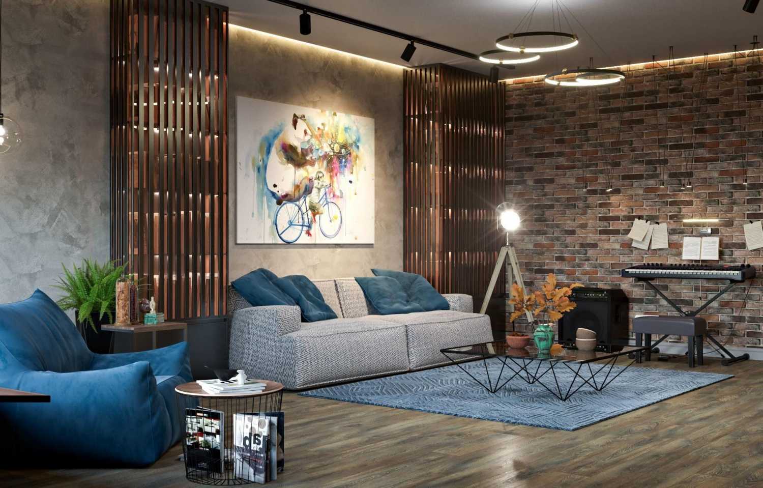 Комбинированное освещение гостиной в стиле лофт с использованием, в том числе, трековых и подвесных светильников