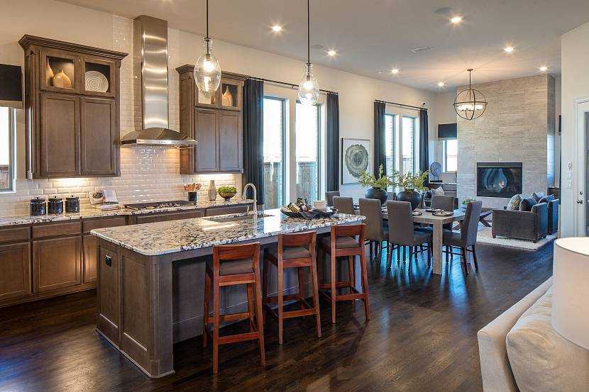 Если вы хотите выделить определённую зону, например, обеденный стол или кухонный остров, люстру смещают в нужную точку