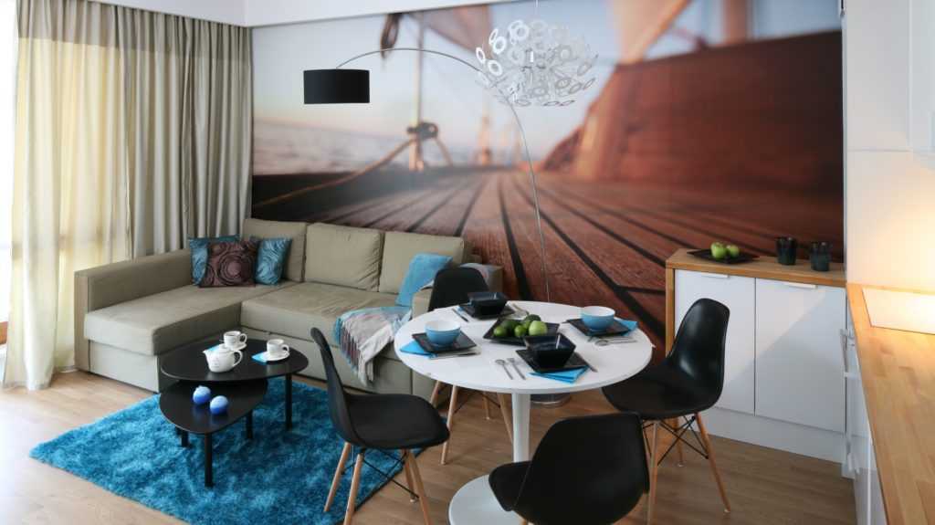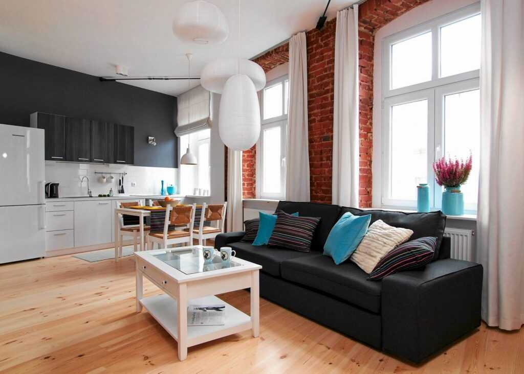 Для этого важно правильно разграничить помещение на функциональные зоны. Главная задача здесь – не отделить комнаты друг от друга, а уменьшить существующие отличия. То есть, необходимо предусмотреть незаметный переход, который сделает помещение единым целым, но при этом сохранит особенности каждой зоны