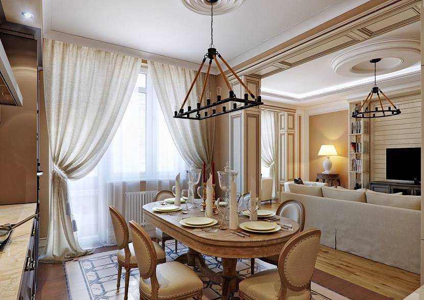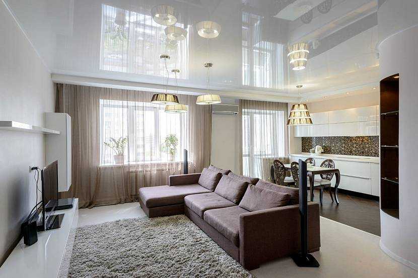 Оформление потолка чаще всего является цветовым продолжением стен, но есть и более современные варианты – комбинированные или двухуровневые потолки с ПВХ или сатиновыми полотнами. Глянцевое или фактурное покрытие гармонично дополнит кухонный гарнитур и обивку мягкой мебели в гостиной.