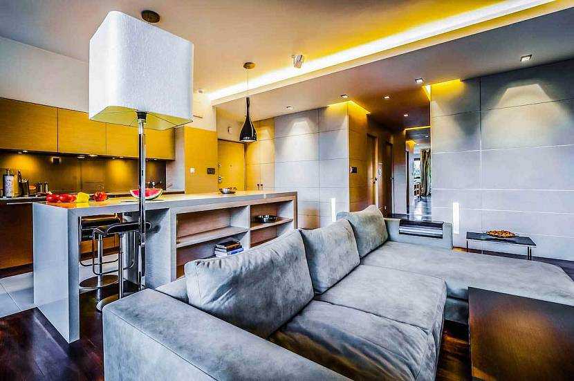 Большая зона отдыха и маленькая кухня? Или, может быть, пополам, потому что вы любите готовить и вам нужно для этого достаточно места? Начать обустройство стоит с примерного разделения на зоны. Если в комнате есть ниша, дело обстоит проще — обычно именно там ставят кухонные гарнитуры со шкафчиками и навесными полками, сделанными по размеру. Однако, когда интерьер прямоугольный, нужно подумать, как его разделить. Здесь хорошо определиться, хотите ли вы выставить мебель для гостиной (красивое кресло, великолепный диван) или просто кухонную зону.