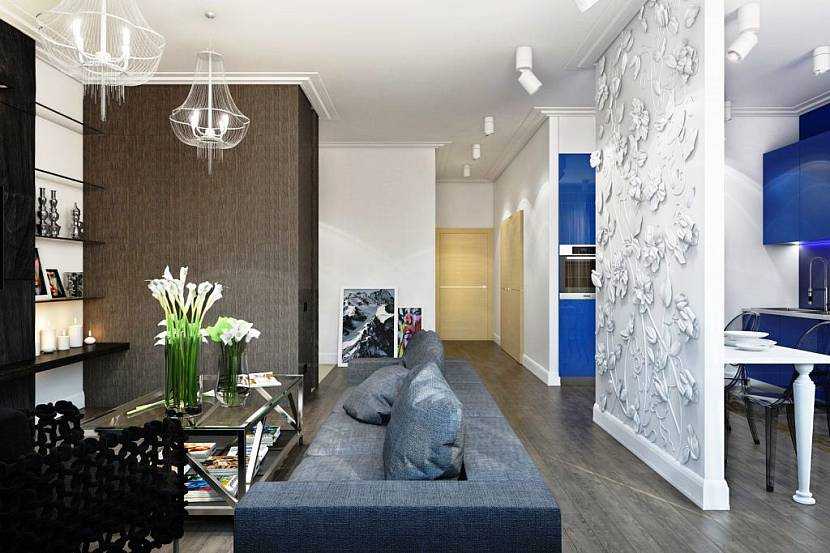 Не забывайте, что темные цвета – пожиратели пространства, их нужно применять в меньшинстве. Модным украшением гостевой зоны станет акцентная стена, роль которой выполнит и разделяющая перегородка.