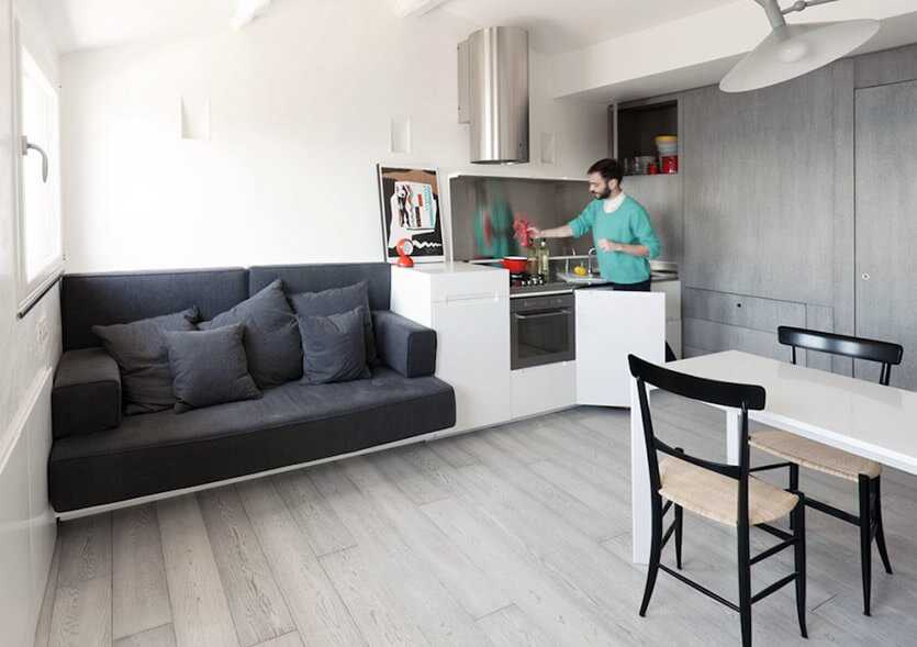 Раздвижные конструкции. Разнообразные ширмы, раздвижные двери и стационарные перегородки помогают спрятать кухню от посторонних глаз. Незаменимая вещь, если в доме случаются гости, которых вряд ли вдохновит перспектива спать на кухне.