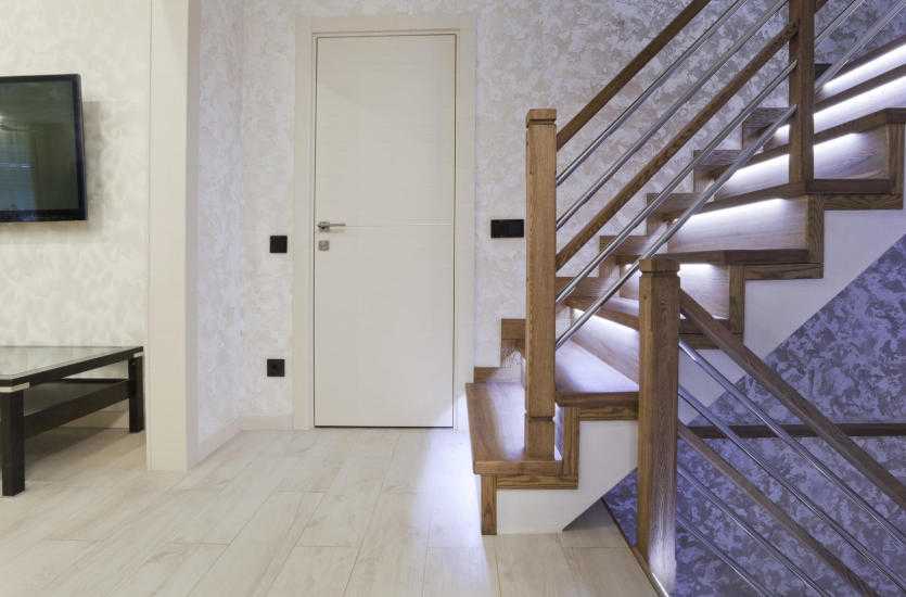 - Ступеньки должны быть освещены: желательно, чтобы подсветка лестницы была автономной от прихожей, стильно выглядит светодиодная подсветка ступеней;