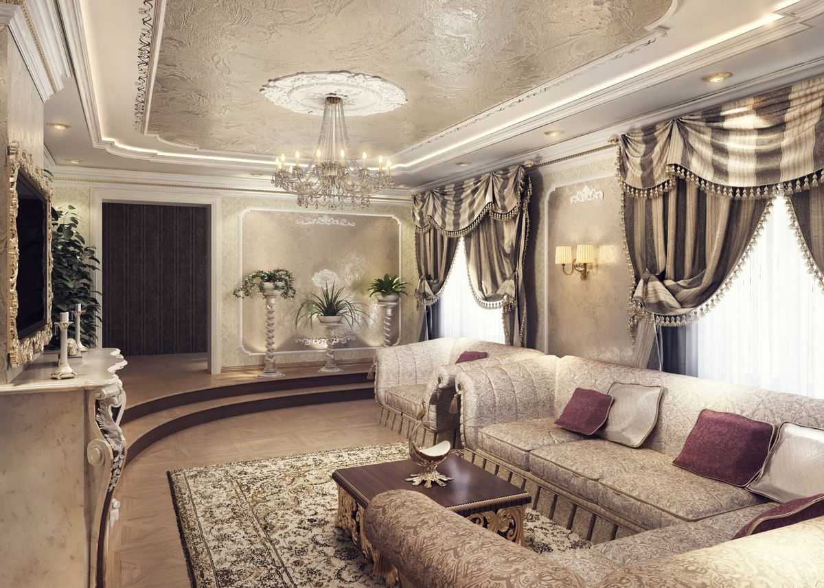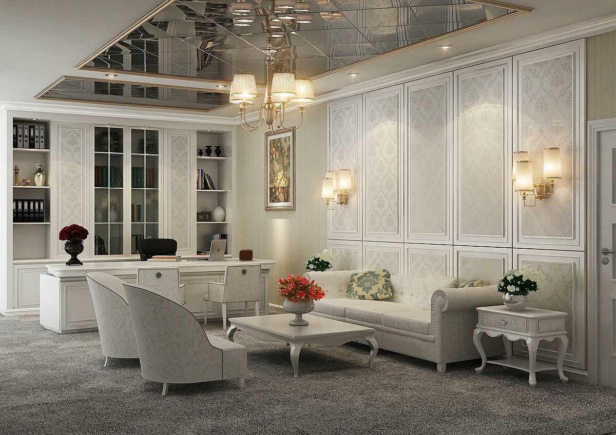 В классическом интерьере используются натяжные потолки преимущественно с матовой либо сатиновой поверхностью. Допускается глянец, но лишь светлых или пастельных оттенков и только в составе двухуровневых конструкций. Чаще всего в виде центральной вставки в гипсокартонный потолок.