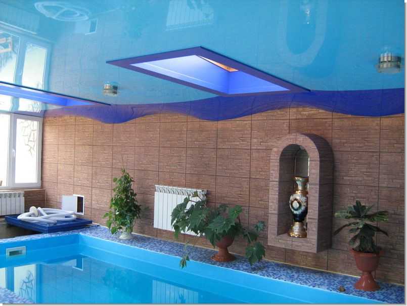 Выбирая, из чего сделать потолок в бассейне, обязательно стоит обратить внимание на внешний вид поверхности после установки. Самым красивым, безусловно, станет натяжной потолок но, он имеет несколько минусов в виде невозможности самостоятельного монтажа и необходимости нагревать воздух в помещении до высокой температуры