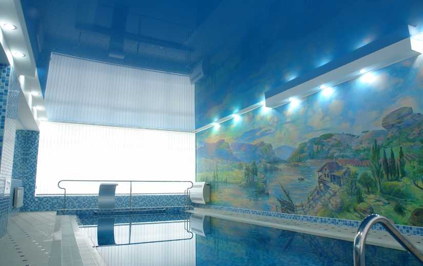 При желании, можно создавать многоярусные композиции, конструкции с плавным переходом между ярусами и даже изгибать покрытие волной. При этом, на монтаж полотна не понадобится много времени – все работы займут один день или даже меньше, в зависимости от сложности форм и количества уровней. Такой потолок украсит бассейн сам по себе, а если воспользоваться современными технологиями фотопечати, то его можно сделать совершенно уникальным.