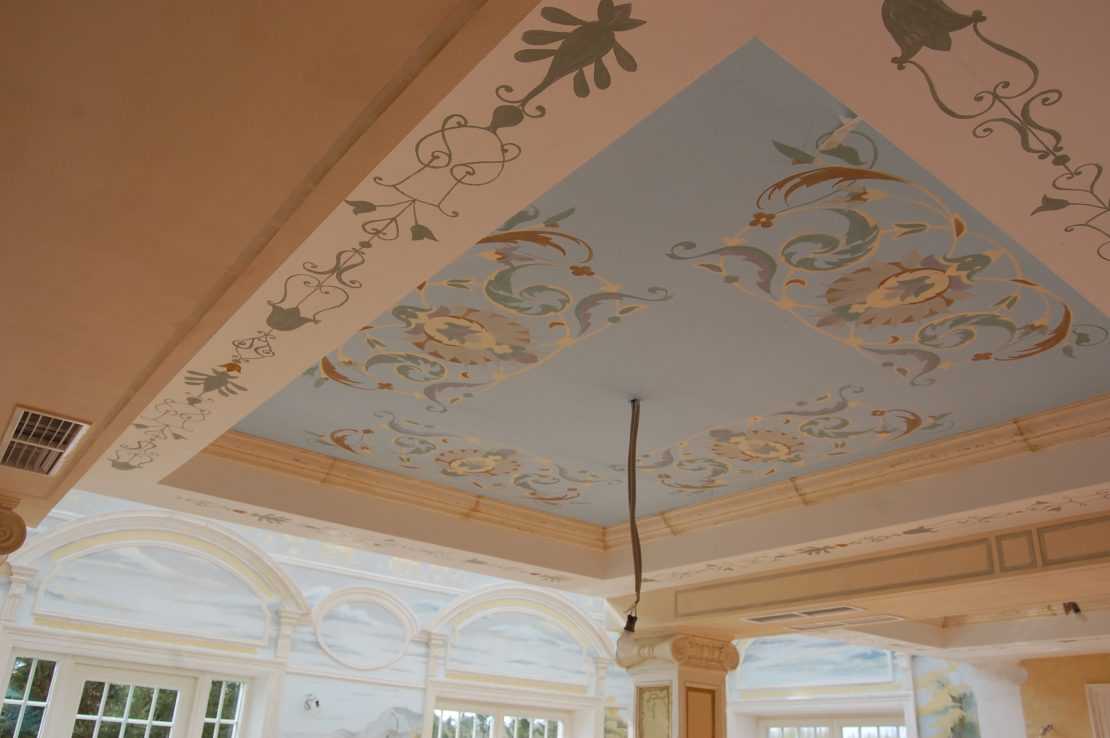 Если не нравится идея обшивки потолка, можно сделать облицовку фактурной штукатуркой или выполнить роспись. Художественная прорисовка требует опыта, а вот справиться с фактурной штукатуркой сможет начинающий мастер. Альфрейная отделка может быть как сплошной, так и локальной, роспись и штукатурку наносят на отдельные зоны, что позволяет визуально разделить пространство, подчеркнуть индивидуальность декора.