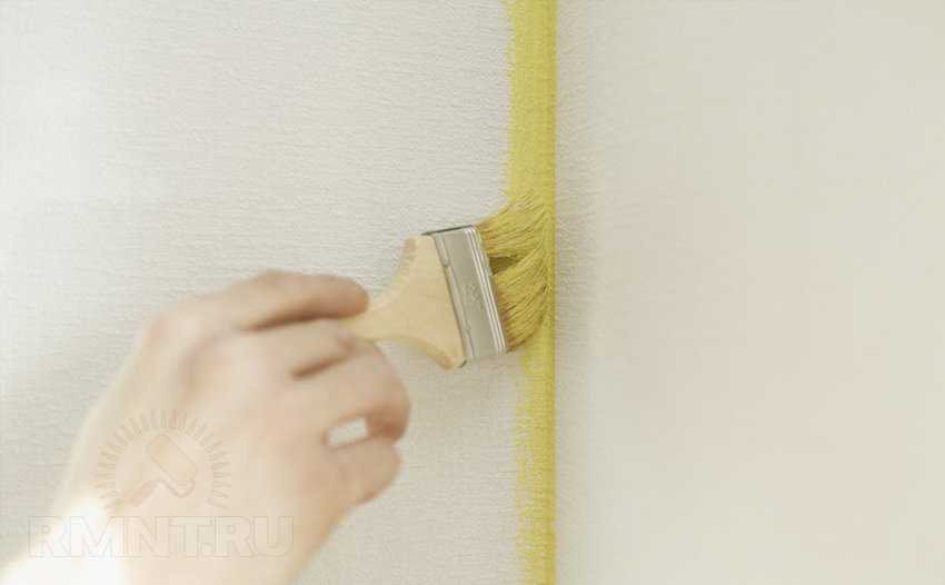 Прежде чем приступить к процессу окрашивания, необходимо нанести в качестве грунтовки разведенный обойный клей. Эта хитрость позволяет сделать швы между полосками обоев менее заметными, а также способствует лучшему сцеплению красящего состава и стеклообоев.