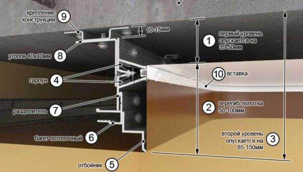 Высота, на которой будет смонтировано полотно, должна быть разумной. Это значит, что для монтажа требуется именно такой отступ от поверхности базового перекрытия, который обеспечит нормальную эксплуатацию конструкции и свободную установку встраиваемых светильников, если они предусмотрены