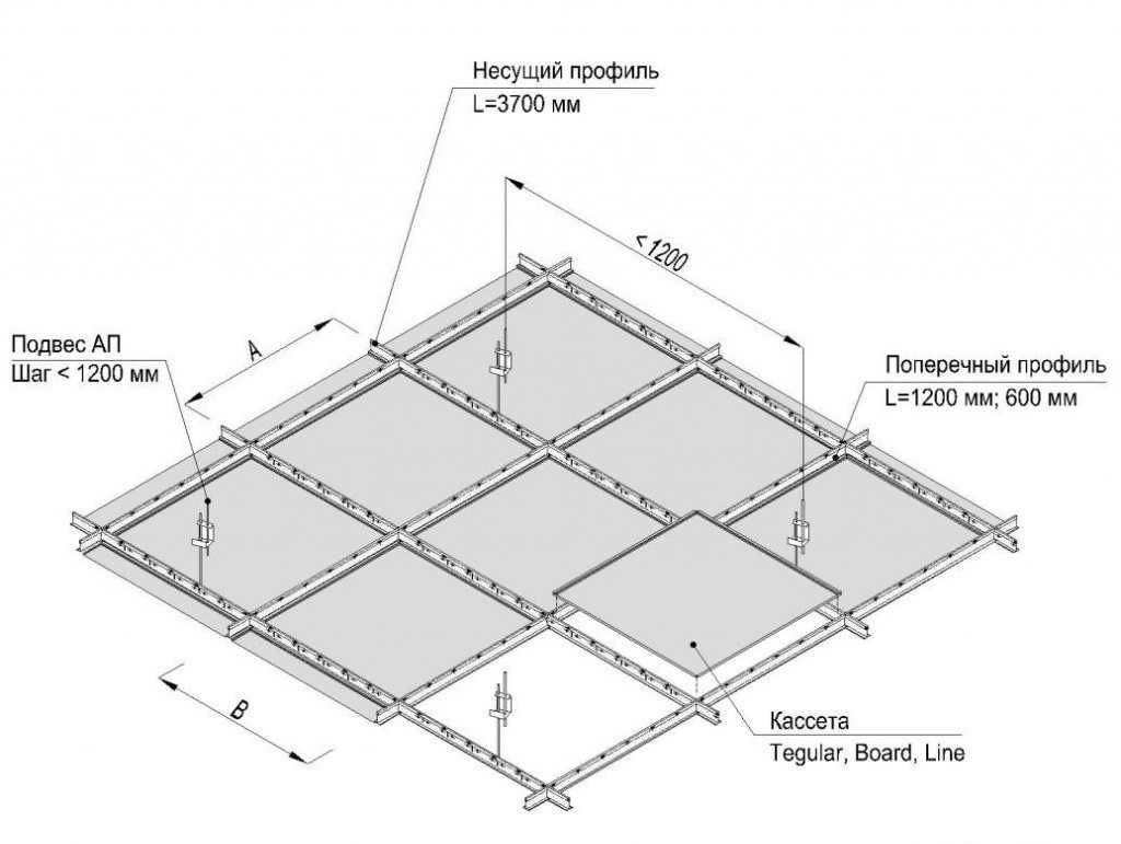 Это основная часть кассетного потолка, отвечающая за его внешний вид. Кассета изготавливается чаще всего из металла и имеет форму квадрата. Размеры могут быть разными, от 30*30 до 90*90 см. |