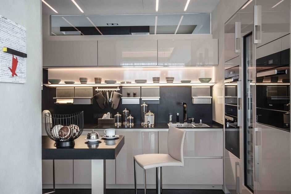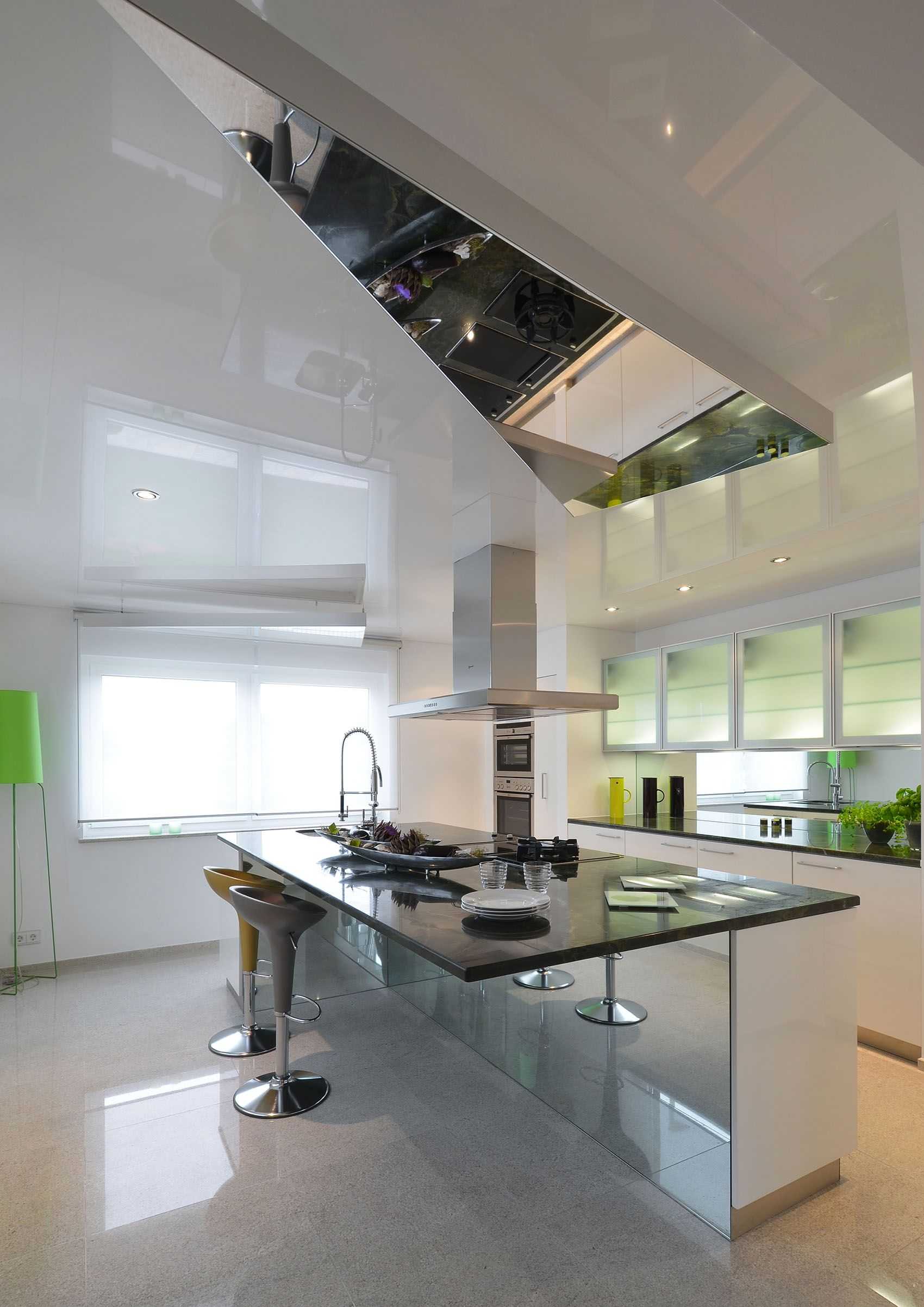 Самым важным плюсом подобного оформления будет возможность расширить границы пространства визуально. Отражения в зеркальной поверхности создают ощущение очень большой высоты даже в самом тесном помещении. Если добавить пару зеркал на стены, то эффект визуального расширения пространства станет еще заметнее.