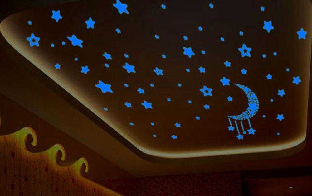 5. Использование акриловой или флуоресцентной краски. Рисунок звездного неба наносят с помощью кисти или распылителя. Недостаток способа — невозможность регулировать интенсивность свечения и его выключения. Рисунок будет виден и днем и ночью.