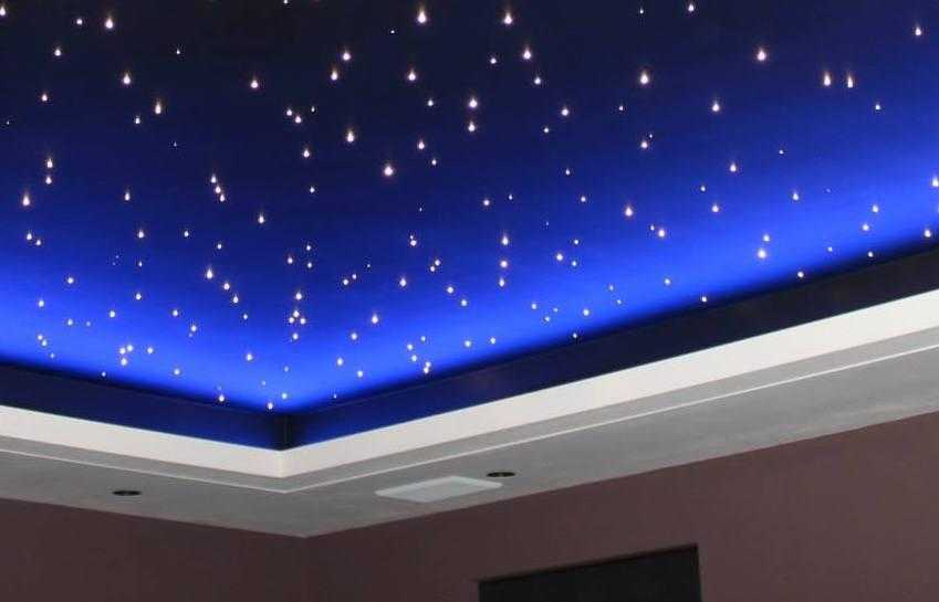 1. С помощью оптоволокон и светового проектора. Классическая конструкция, которая выглядит максимально естественно. Оптоволокна и световой проектор прячутся внутри полотна. Их производство — сложный и трудоемкий процесс. Каждая звездочка — это светящаяся нить оптоволокна, сеть из которых подсоединяются к проектору. Звездное небо из оптоволокон можно сделать только на тканевом полотне.