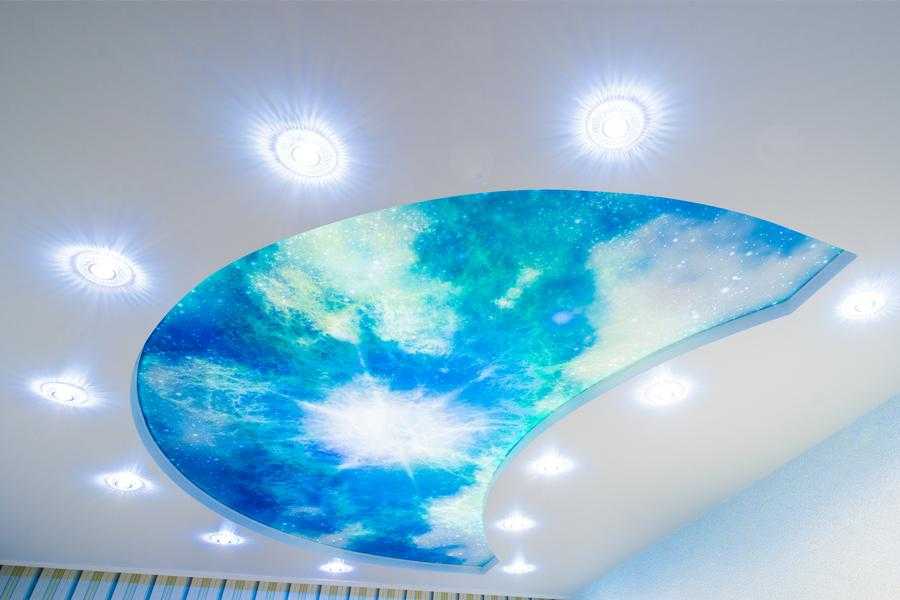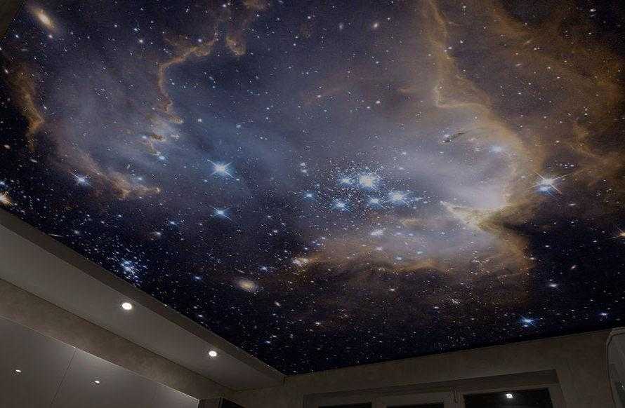 2. С помощью нанесения фотопечати по технологии New Vision на ПВХ-полотне. На пленку с изнаночной стороны наносится рисунок с изображением космического неба, а на основной черновой потолок по всей площади равномерно крепится светодиодная лента. В обычном состоянии потолок представляет собой белую ровную поверхность, а при включении светодиодов появляется изображение.