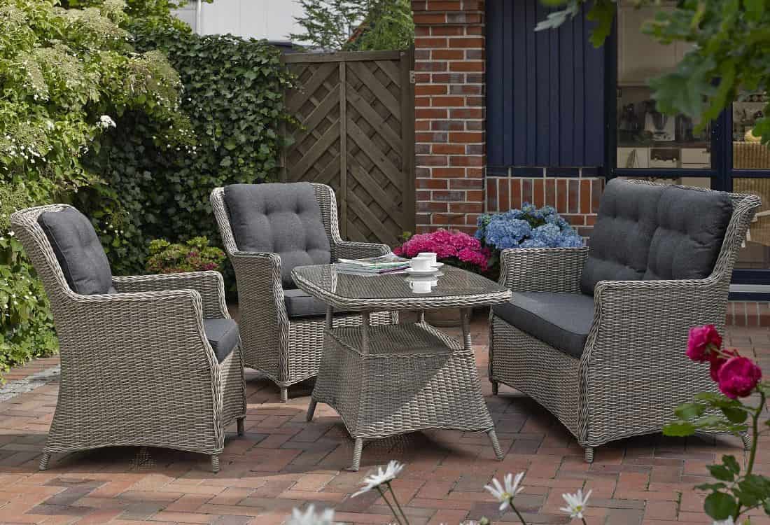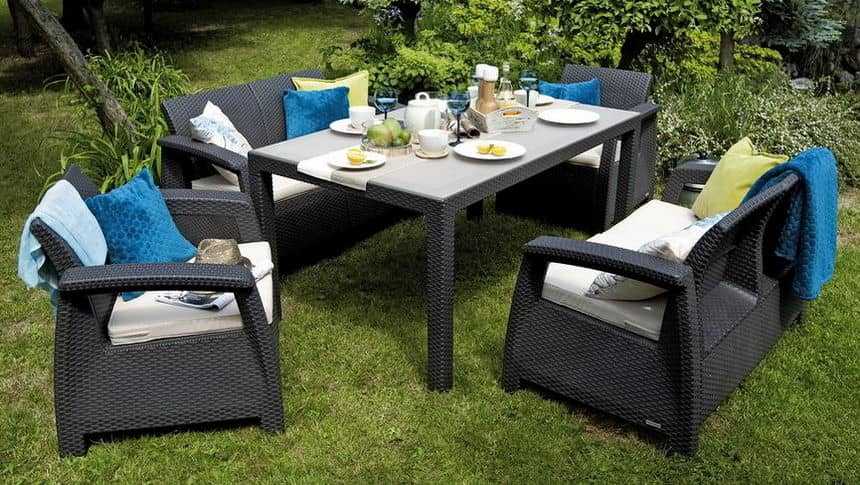 Столовая мебель в саду — это еще не все. Чтобы полноценно наслаждаться приятным отдыхом среди цветущей зелени, необходимо купить еще и полный комплект меблировки. Наборы включают в себя диван, два кресла или стулья, плюс невысокий журнальный столик. Самые модные считаются конструкции, выполненные из ротанга, усыпанные большими подушками.