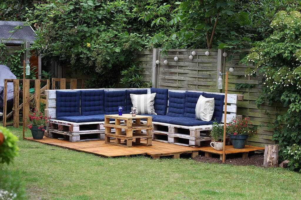 Также достаточно популярной является деревянная мебель сделанная из поддонов. Такую конструкции очень просто сбить, покрасить и пропитать. Подушки также можно пошить самостоятельно или купить в магазине садовых аксессуаров.