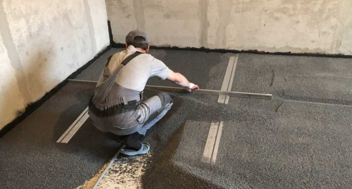 На очищенный пол с выполненной гидроизоляцией стыков устанавливают маяки. Между ними засыпают сухой изоляционный материал: это может быть керамзит, полистирол или кварцевый песок. Высота маяков не должна превышать высоту слоя засыпки. Засыпку разравнивают длинным правилом и оставляют на сутки.