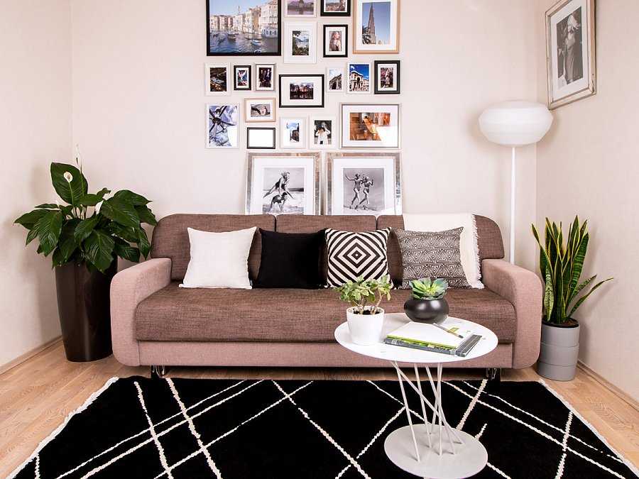 Если гостиная небольшая, целесообразно положить маленький круглый или прямоугольный ковер в зоне перед диваном. Этот прием позволяет визуально увеличить площадь комнаты. В идеале палас не должен заходить под мебель, однако на нём может располагаться обеденный или журнальный столик.