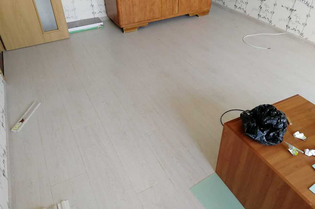 Из брака заметили одну доску с битым углом и одну с трещиной на декоративной пленке под защитным слоем. Помимо комнаты, должны были укладывать ламинат в коридоре, но по расчетам не хватало одной упаковки, поэтому перенесли дату окончательного завершения работ на следующую неделю.