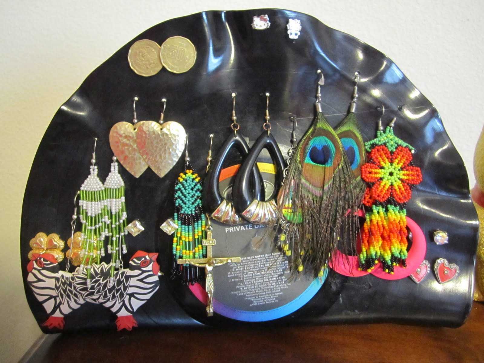 Девушкам можно предложить использовать старую пластинку в качестве панно для бижутерии. Загните край пластинки с помощью горячей воды, чтобы добавить ей устойчивости. Просверлите несколько дырок – это будут места хранения сережек, также можно воткнуть небольшие гвоздики – таким способом отлично разместятся браслеты, цепочки и бусы.