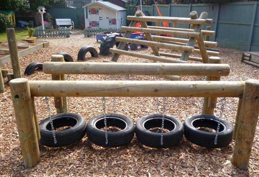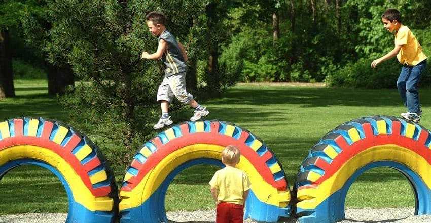 Очень часто, находчивые дачники используют автомобильные шины для обустройства спортивных площадок. Из них получаются отличные полосы препятствий с преградами и игровыми элементами, на которых ваши дети смогут не только хорошо и весело проводить свободное время, но и развивать свою ловкость и выносливость.