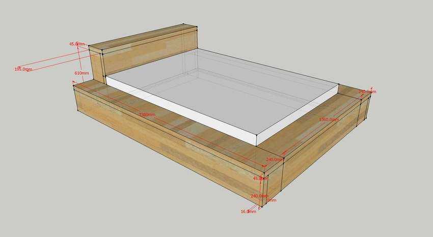 Изначально определяются с местом, где будет располагаться кровать-подиум. Чертежи и размеры наносят в соответствии с желаемой конструкцией. Затем начинается подготовительный этап, когда собирают всё необходимое для работы. Сечение брусьев определяют в зависимости от размера кровати. В среднем это 5 х 5 см. Под каркас задействуют крепкую древесину, которую соединяют по площади матраса. По сторонам оставляют припуск примерно 5–10 мм.
