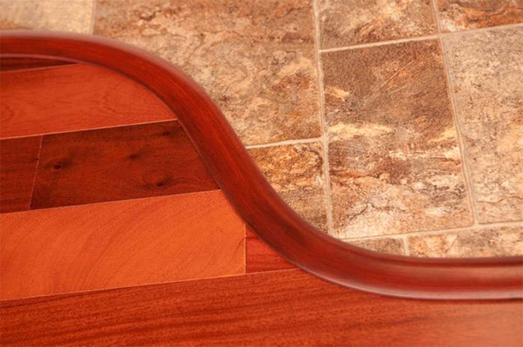 Если же стык является криволинейным, необходимо использовать гибкий порожек. Перед непосредственным применением таких эластичных профилей рекомендуется нагревать их строительным феном — в этом случае они становятся более эластичными. Если делается криволинейный стык при комбинировании напольных покрытий, желательно добиться одинаковой высоты, поскольку гибкие порожки не очень удачно сглаживают перепады. Когда перепада нет, гибкий молдинг смотрится как декоративный бордюр, а не как явная маскировка стыка.