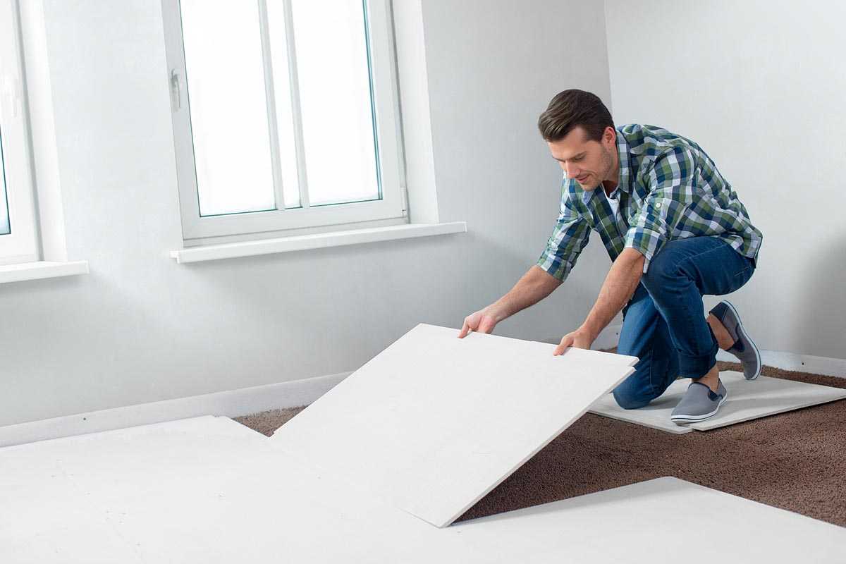 Рассчитать количество нужного материала несложно. Демпферной ленты достаточно использовать в количестве, равном периметру обустраиваемой комнаты без учета ширины дверного проема. Количество материалов, которые будут непосредственно стелиться на пол, используется столько же по площади, сколько равна и сама площадь комнаты. Количество листового материала посчитать просто: площадь пола делится на площадь одного листа или плиты. Получается нужное число элементов.