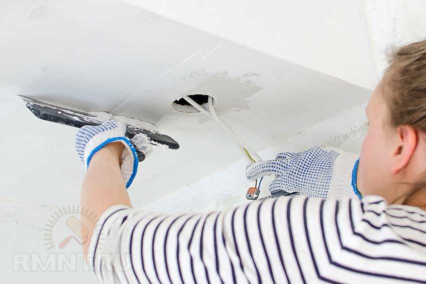 Также поступают для устранения любых дефектов. Если нужно заделать дырку, трещину или скол на потолке, их также необходимо отчистить, прогрунтовать. Для дефектов значительной площади использовать армирование стекловолоконной или металлической штукатурной сеткой.