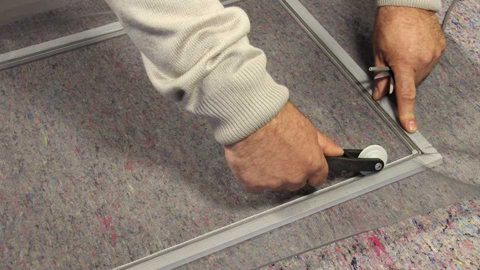 На следующем этапе сетку натягивают на специальный закрепительный шнур, который изнутри фиксируется в проем рамы. В итоге полотно надежно натягивается и его можно закрепить уже окончательно. После этого, на раму устанавливаются специальные металлические элементы в виде уголкового профиля, который необходим для фиксации полотна в оконном проеме. На финальном этапе к москитной защите присоединяются две специальных ручки, которые позволят надежно закрепить сетку в окне.