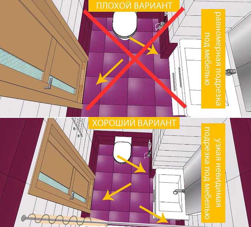 Ускорить процесс поможет предварительное вычерчивание плана помещения с учетом всех не подлежащих демонтажу элементов обстановки или оборудования (сантехника, встроенная мебель и прочее). В этом случае можно сразу выбрать места, где будет укладываться подрезанная плитка, чтобы максимально замаскировать эти места.