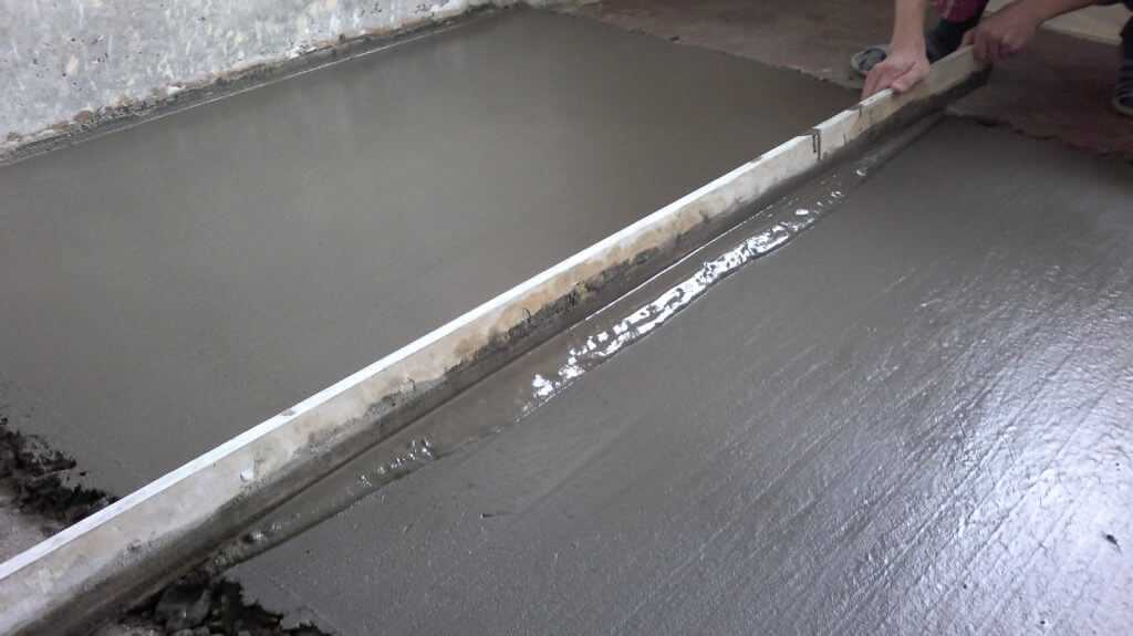 Достигнув нужного уровня, обозначенного маяками, излишки удаляются правилом. Ходить по поверхности разрешается через 2-3 часа. В это время нужно выполнить финишное выравнивание и заглаживание основания металлизированной щёткой.