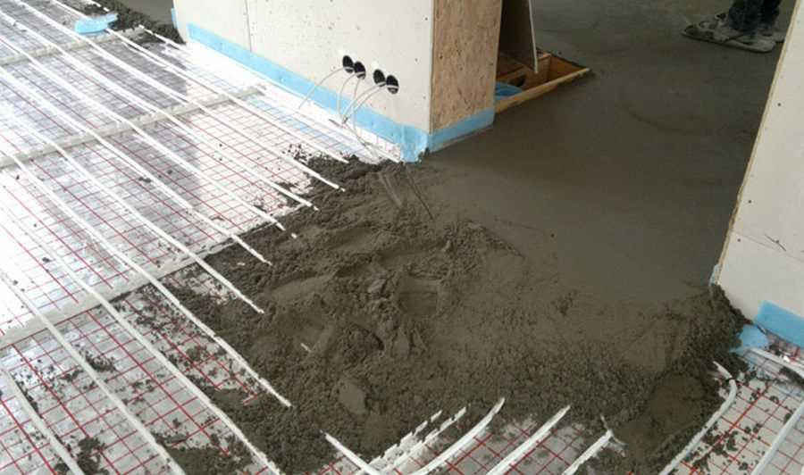 Нередко данный метод применяют в случае установки пола с электроподогревом, однако применяем он и в водяных системах. Толщины стяжки должно хватить, чтобы полностью покрыть трубы (стяжка располагается в 30 мм над уровнем труб). Во время монтажа системы рекомендуется надевать мягкую обувь и стараться передвигаться так, чтобы не наступить на какой-нибудь элемент системы отопления.