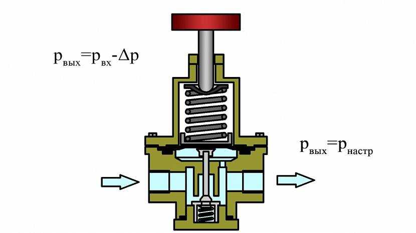 Принцип его работы схож с тем, как регулируется поток воды вентильным краном, при откручивании которого шток с поршнем поднимаются и открывают просвет определённого сечения. Но в этом случае при увеличении напора в системе поршень остаётся неподвижным, и сила водяного потока возрастает. Тогда как клапан давления воды в редукторе в такой ситуации меняет своё положение и уменьшает просвет.