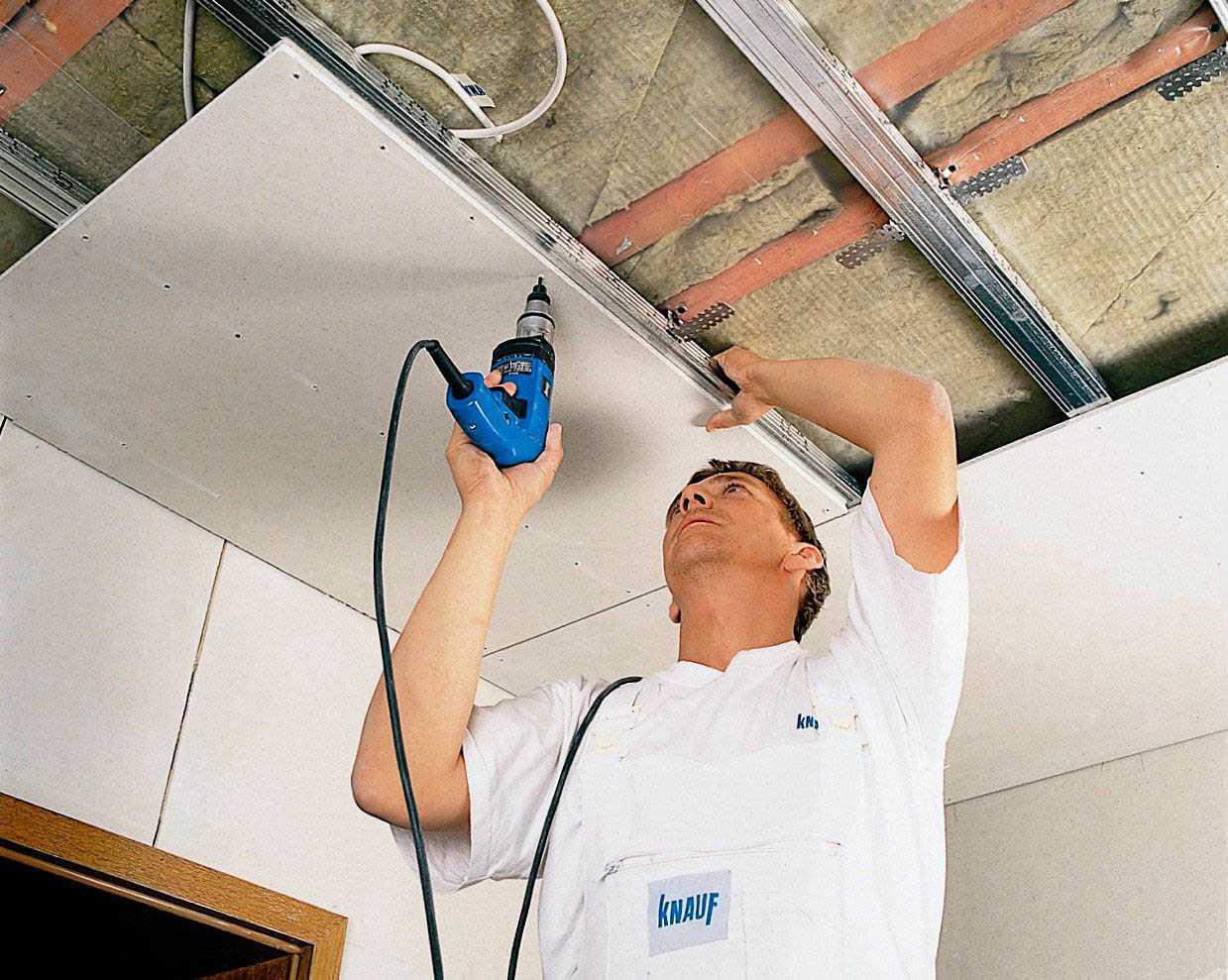 Монтаж листов ГКЛ начинайте на ровных участках потолка. Прикручивайте их шурупами по дереву с помощью шуруповерта либо дрели, работающей на низких оборотах .