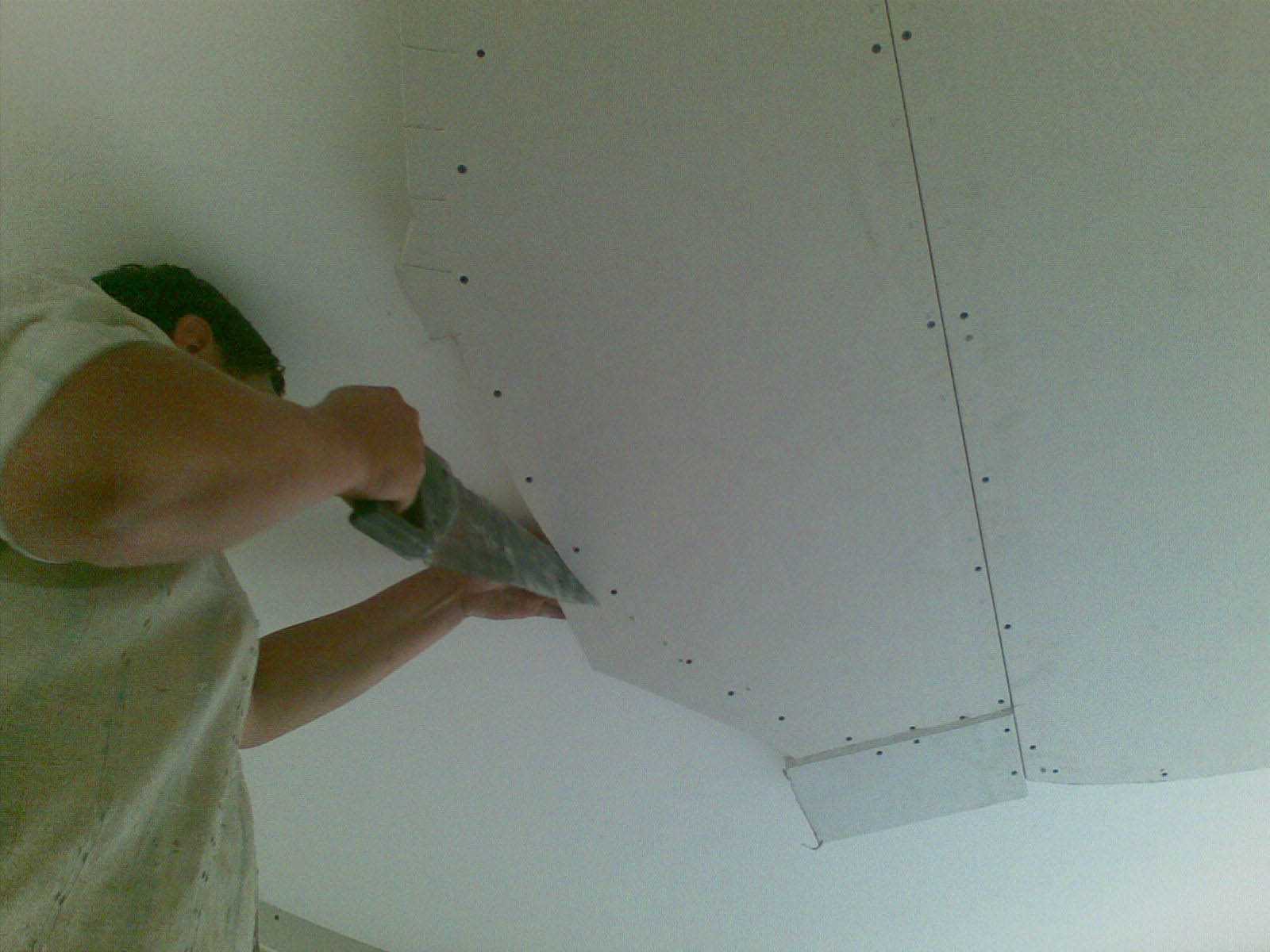 - Начинать шпаклевку нужно именно с тех мест, где листы подходят друг к другу. Шпаклевка наносится на эти участки, закрывается самоклеящейся сеткой и выравнивается. Когда материал полностью высохнет, можно приступить обработке всей поверхности потолка финишным слоем.
